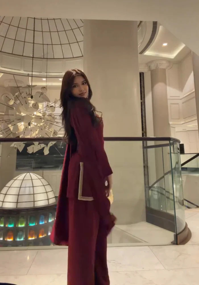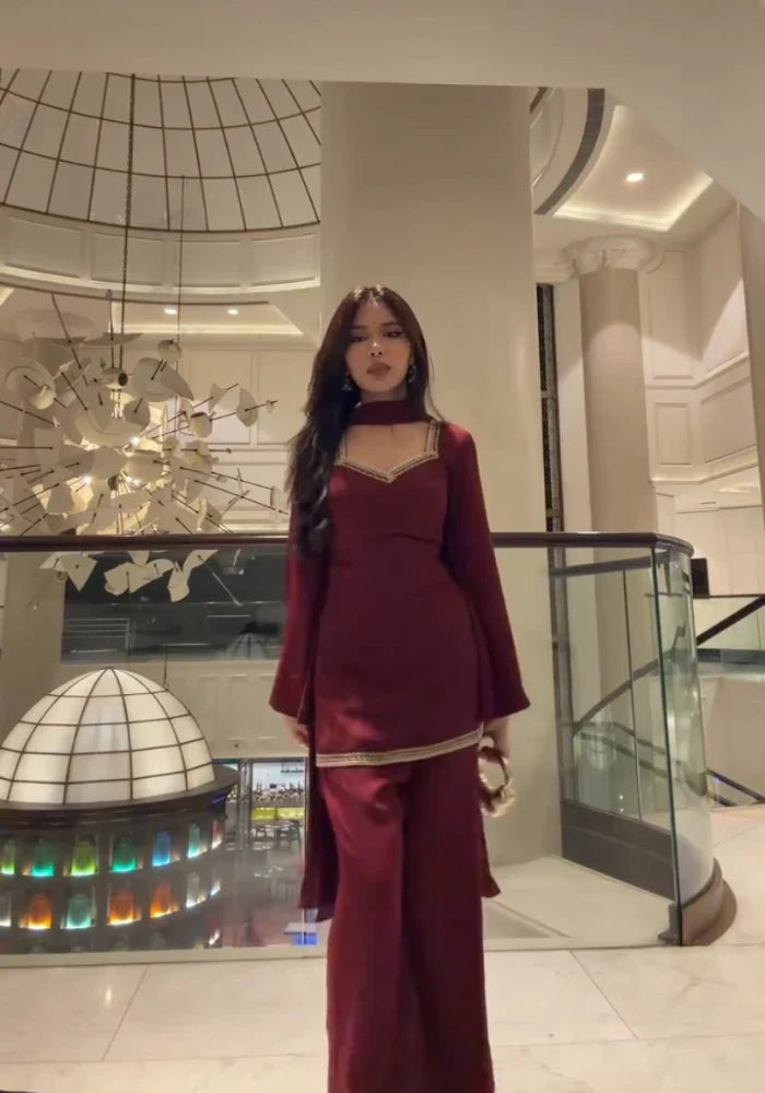 Maroon Georgette Border Set, designed for those who love subtle luxury. The rich wine-maroon tone paired with delicate golden lace creates a look that’s elegant, timeless, and beautifully flattering.